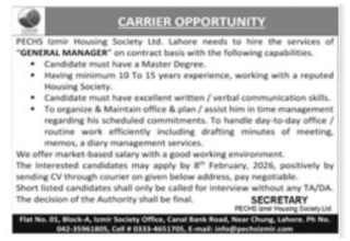 All interested in looking for the PECHS Jobs vacancies 2026 then this is one of the best opportunities for one of those. We got the PECHS Izmir Housing Society Lahore jobs from the daily jang job on 25 january 2026.
